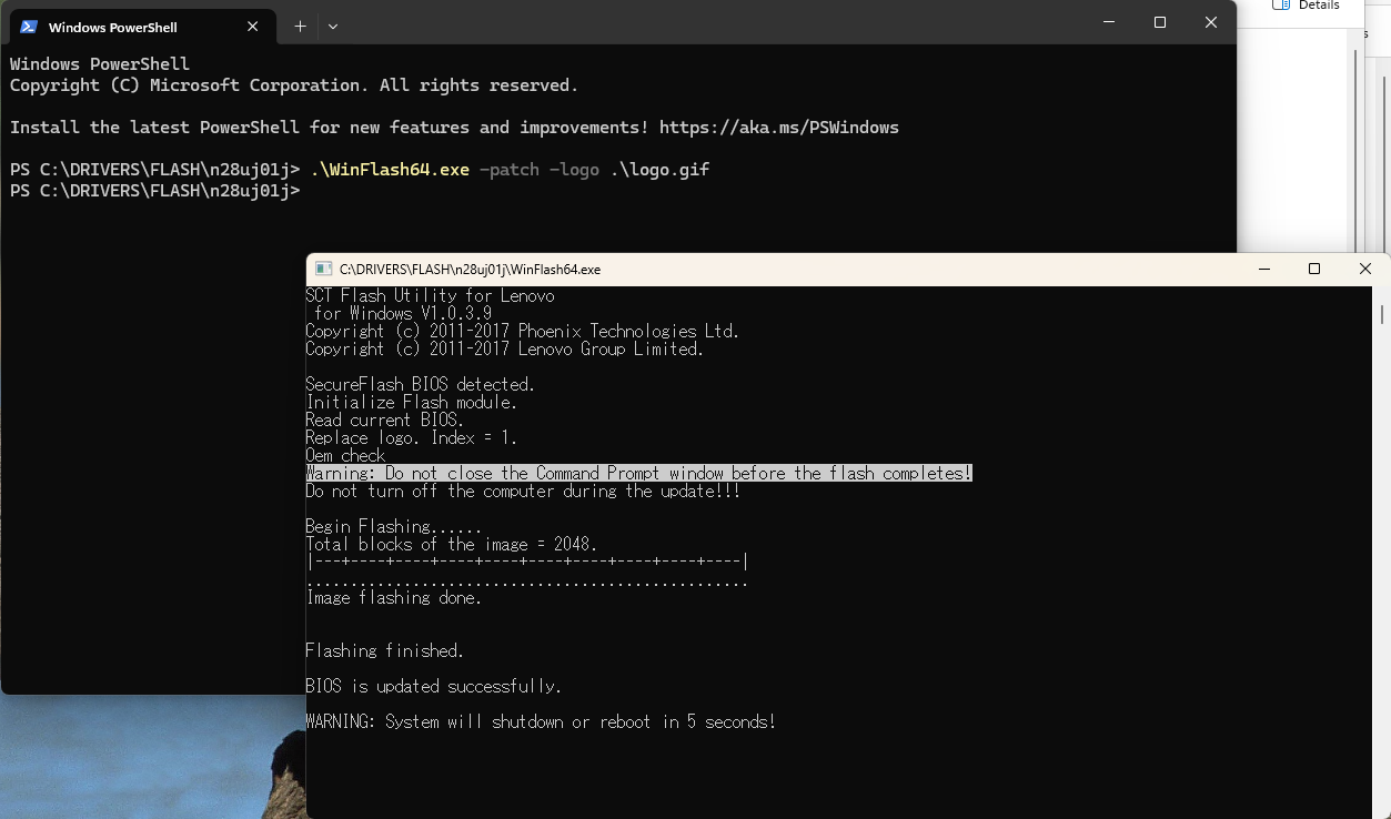 뭔가 저 프로그램에 문제가 있는 것 같아서 같은 폴더에 들어있는 WinFlash를 사용해 주니 다행히 정상적으로 로고 변경이 가능했다.